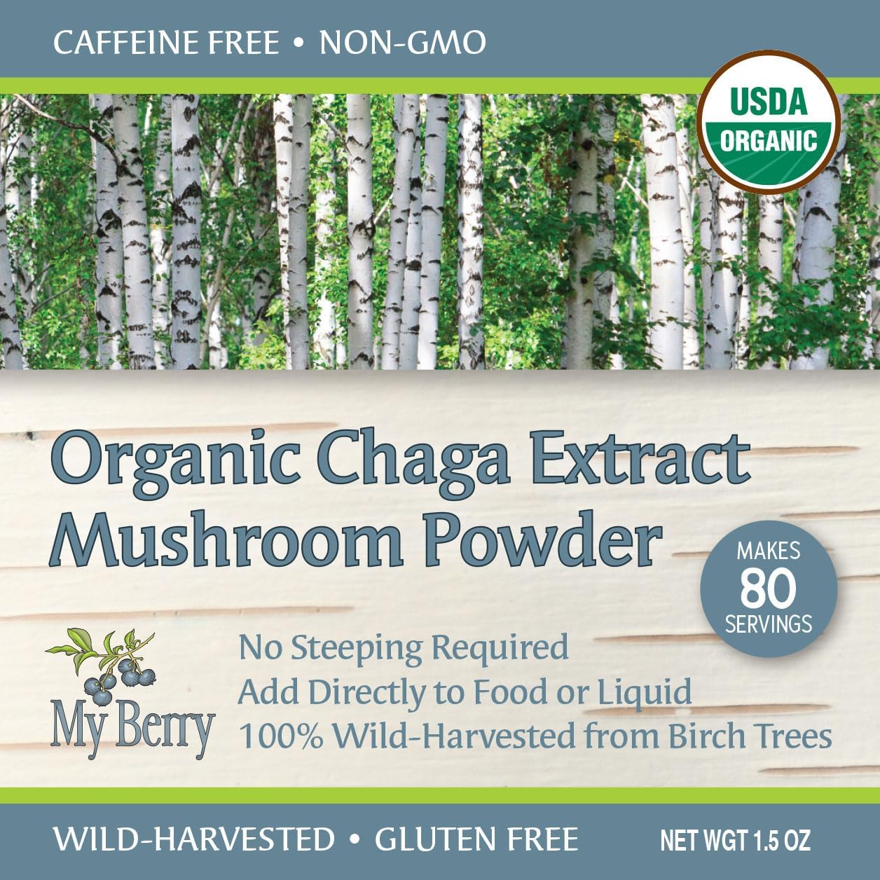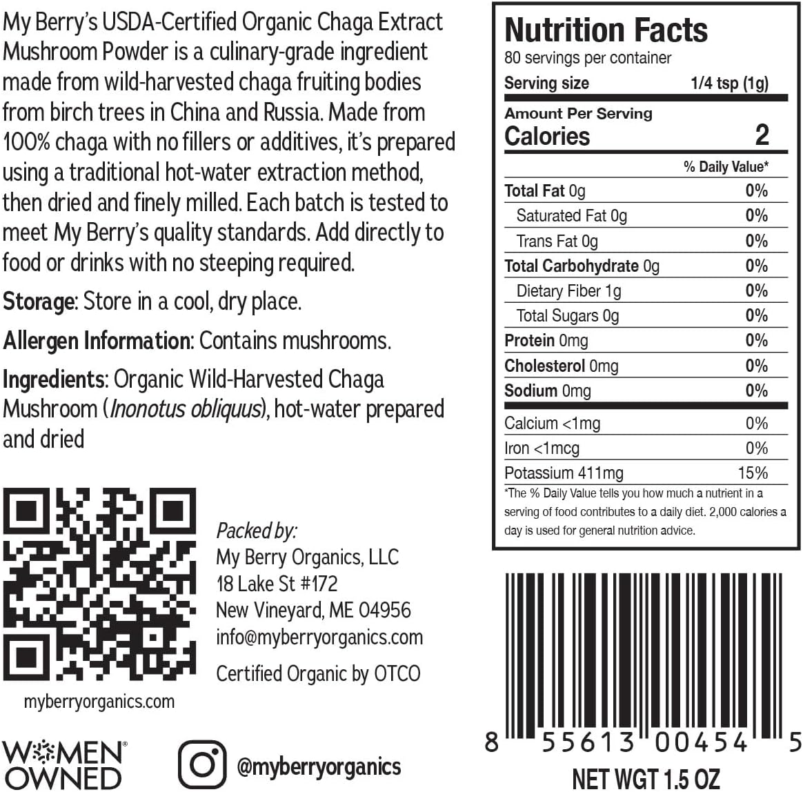 My Berry’s Organic Chaga Extract Mushroom Powder is a culinary-grade mushroom ingredient prepared using a traditional hot-water extraction method, then gently dried and milled into a fine powder. This preparation method allows the mushroom’s water-soluble components to be captured in a form that can be easily incorporated into foods and beverages. The resulting powder is intended for cooking and beverage preparation and can be added directly to coffee, tea, smoothies, broths, or recipes without the need for steeping or straining. Made from 100% USDA-certified organic, wild-harvested chaga mushroom and containing no fillers or additives, this product is crafted with a focus on ingredient quality and culinary versatility. Ingredients: Organic Wild-Harvested Chaga Mushroom (Inonotus obliquus), hot-water prepared and dried Allergen Information: Contains mushrooms. Storage: Store in a cool, dry place.